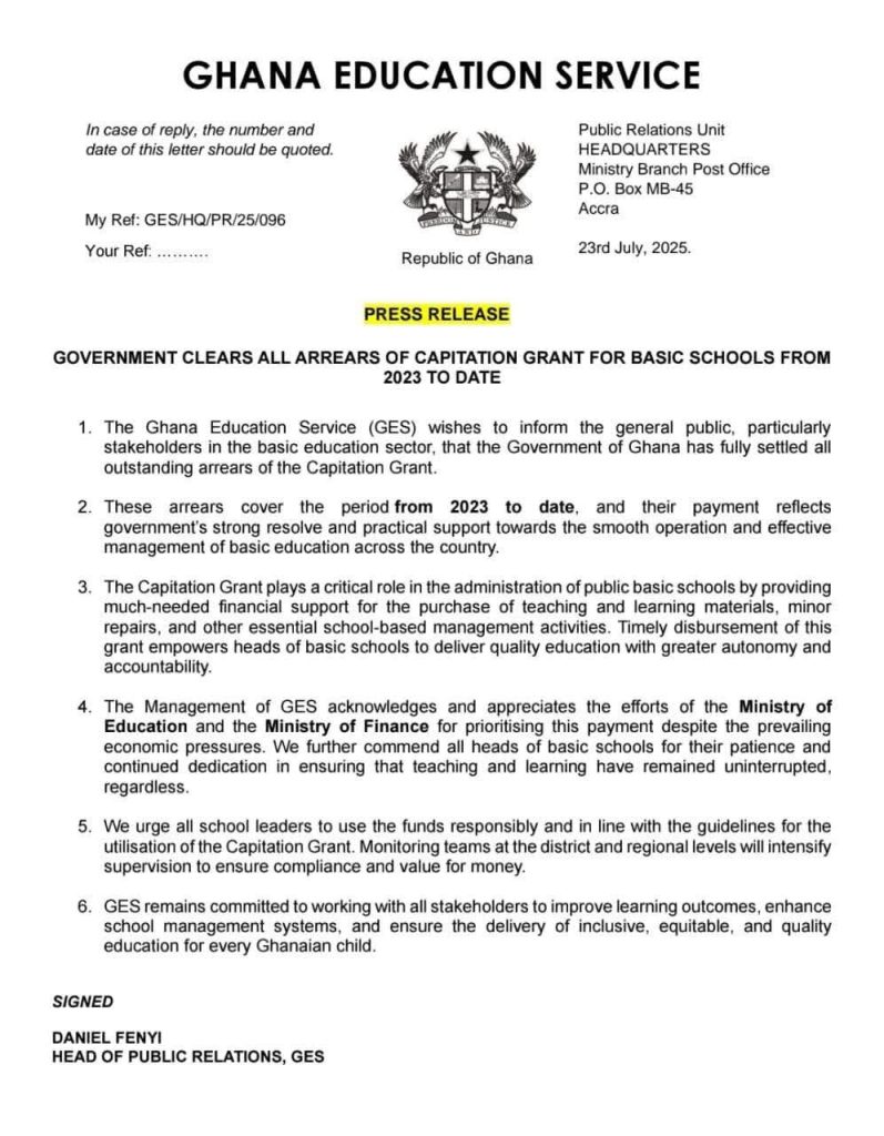 Accra, Ghana — In a significant boost for basic education in the country, the Government of Ghana has cleared all outstanding arrears of the Capitation Grant for public basic schools, covering the period from 2023 to date.