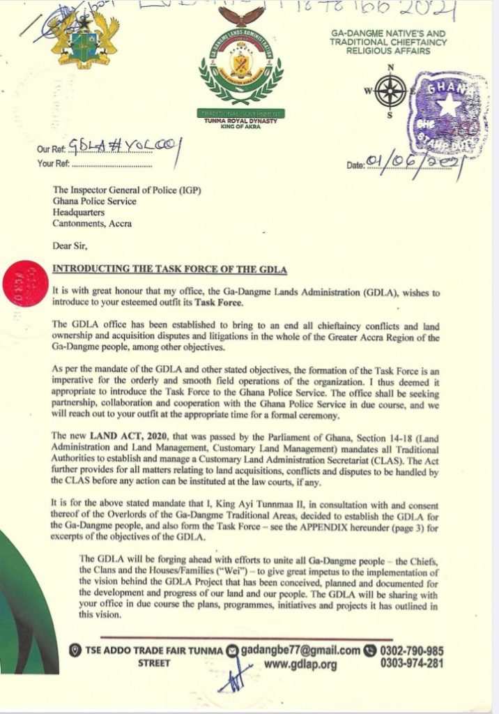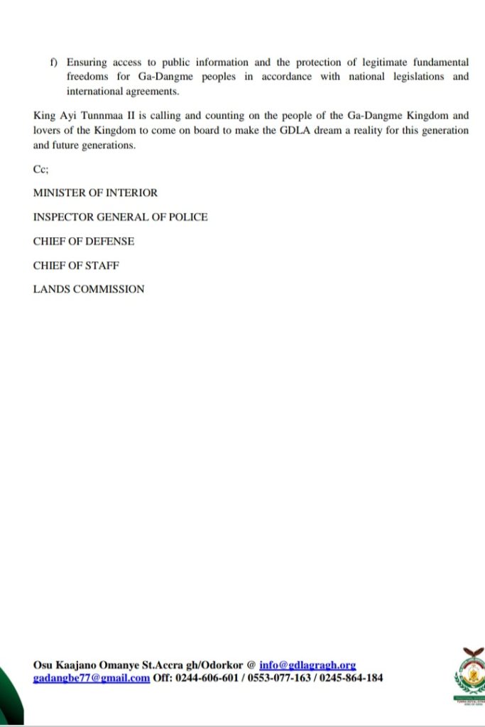 “We have established the GDLA to resolve land issues and challenges dating back as far back as the days of Ghana’s independence. A lot of lands leased to the government have expired but successive Governments after government, have failed to renegotiate or pay the appropriate renewals or whatever that is due the Ga Dangme people,” King Ayi Tunnma lamented.