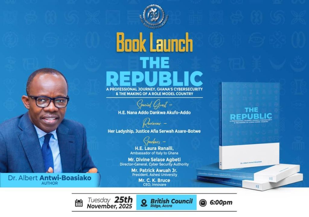 Accra, Ghana–[24-11-2025]—Ghana’s cybersecurity stakeholders—comprising industry, public sector and international organisations/development partners are set to converge for the official launch of a new book titled “The Republic: A Professional Journey, Ghana’s Cybersecurity and The Making of a Role Model Country”, authored by Dr. Albert Antwi-Boasiako, a Cybersecurity Expert and the Former Director-General of the Cyber Security Authority, Ghana.