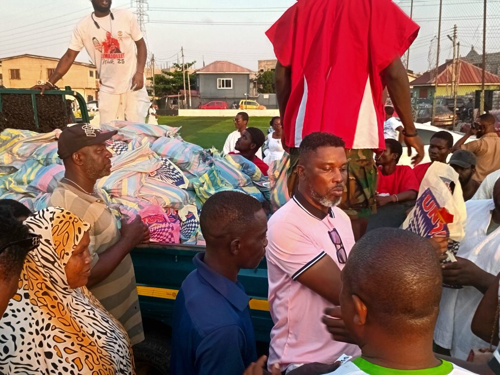 Residents from Alajo, Kotobabi Down and Newtown Down gathered in large numbers to receive assorted food items and essential supplies meant to cushion them against post-Christmas economic pressures.