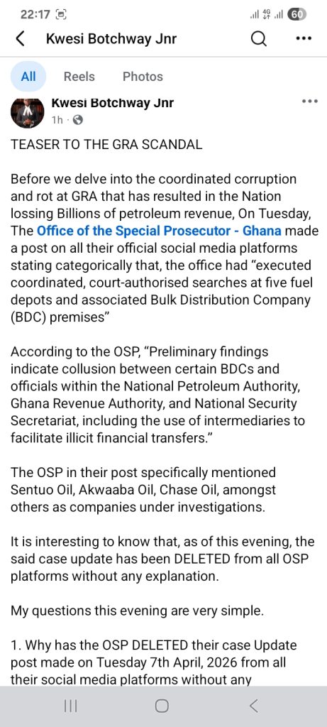 Before we delve into the coordinated corruption and rot at GRA that has resulted in the Nation lossing Billions of petroleum revenue, On Tuesday, The Office of the Special Prosecutor – Ghana made a post on all their official social media platforms stating categorically that, the office had “executed coordinated, court-authorised searches at five fuel depots and associated Bulk Distribution Company (BDC) premises”