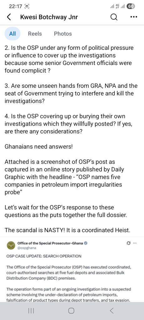 Attached is a screenshot of OSP’s post as captured in an online story published by Daily Graphic with the headline – “OSP names five companies in petroleum import irregularities probe”